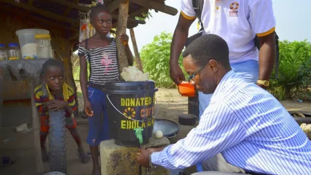 Photo: Here, individuals use a public hand washing station in a Liberian village; staff and community healthcare workers encourage people to consistently wash hands whenever leaving and entering a building or house to prevent the spread of Ebola. Credit: David Lai/CARE