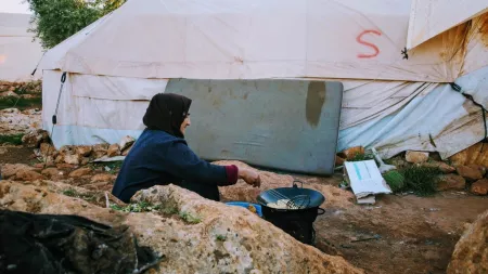Photo: Dalia*, a displaced woman from southern Idlib fries bread for Iftar. She uses nylon and cardboard to light the fire outside her tent. “I am not used to this. This is not something we had to do I was living in my home in the village before displacement,” she says. Credit: SRD/CARE